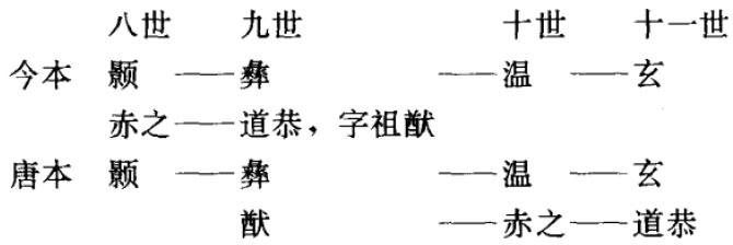 案《世说人名谱》之《桓氏谱》及《世说新语·规箴》“桓南郡好猎”条注引《桓氏谱》(《世说人名谱》中之《桓氏谱》,与《世说新语》政事、规箴、贤媛、仇隙诸篇刘孝标注引之《桓氏谱》,两者关系似不甚明。《世说》刘注引《桓氏谱》自当作于梁代以前,但是隋、唐、宋志皆不著录,章、姚考隋志及诸家补晋志者或不著录,或无说明。而《世说人名谱》的人物内容,有谱及陈、隋者(如《琅邪王氏谱》),有引《元和姓纂》及《新唐书·宰相世系表》之说者(如《陈郡袁氏谱》),即宋代汪藻据所见诸书增益而成。参《世说人名谱》中《琅邪临沂王氏谱》谱首自注。所以其中之《桓氏谱》或亦有汪藻增益之处。),所记桓颢与桓赤之以及桓彝与桓道恭,行辈全符;所记桓道恭事迹虽有详略,并无抵牾。但是,桓玄与桓道恭关系,值得探究。他们二人,于公,王法为重,桓道恭可屈居桓玄之下为贼曹参军;于私,则家礼在,道恭必不可称呼孙辈的桓玄为“公”,并且惧玄系缚。道恭伏诛于义熙初,但为道恭同堂兄的桓彝则死于咸和时,距道恭之死近八十年之久,即令以嫡庶年差解释,亦似难通。